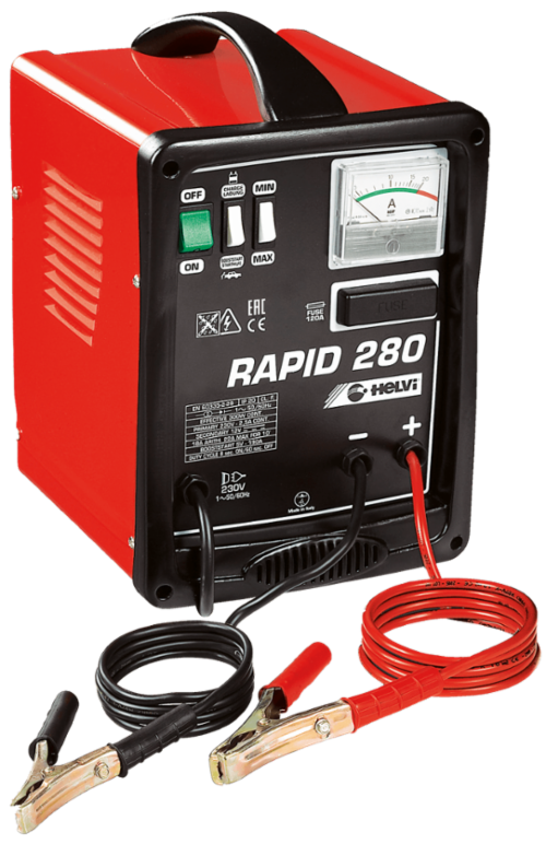 Chargeurs de batterie portatifs avec auxiliaire de démarrage. Dotés de sélecteur du courant de charge, d’ampèremètre, disjoncteur thermique contre les démarrages prolongés, fusible interne contre les courts-circuits et inversion de polarité.